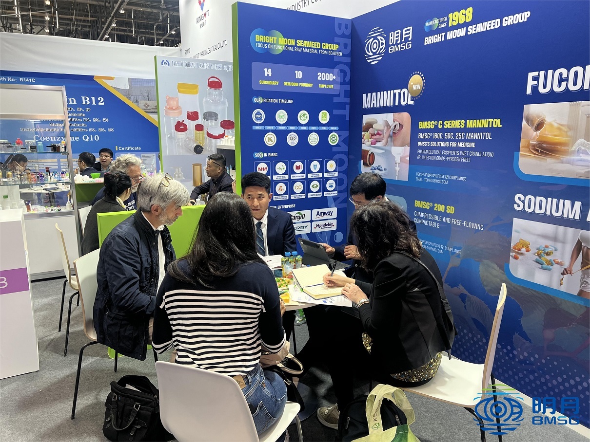 At this Vitafoods Europe exhibition, the Bright Moon professional sales team led by the Senior Vice President of the group, Jinlong Pang, showcased Bright Moon's three main industries to international clients: ALGINATE, MANNITOL, FUCOIDAN.