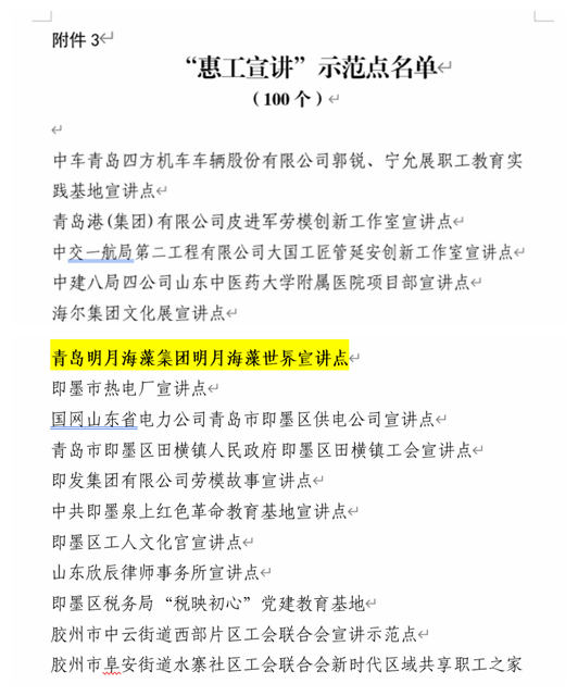 3月9日,從青島市總工會(huì)獲悉,青島明月海藻集團(tuán)的“明月海藻世界”被評(píng)選為青島市職工思想政治教育實(shí)踐基地;“明月海藻世界宣講點(diǎn)”被評(píng)為青島市“惠工宣講”示范點(diǎn)。