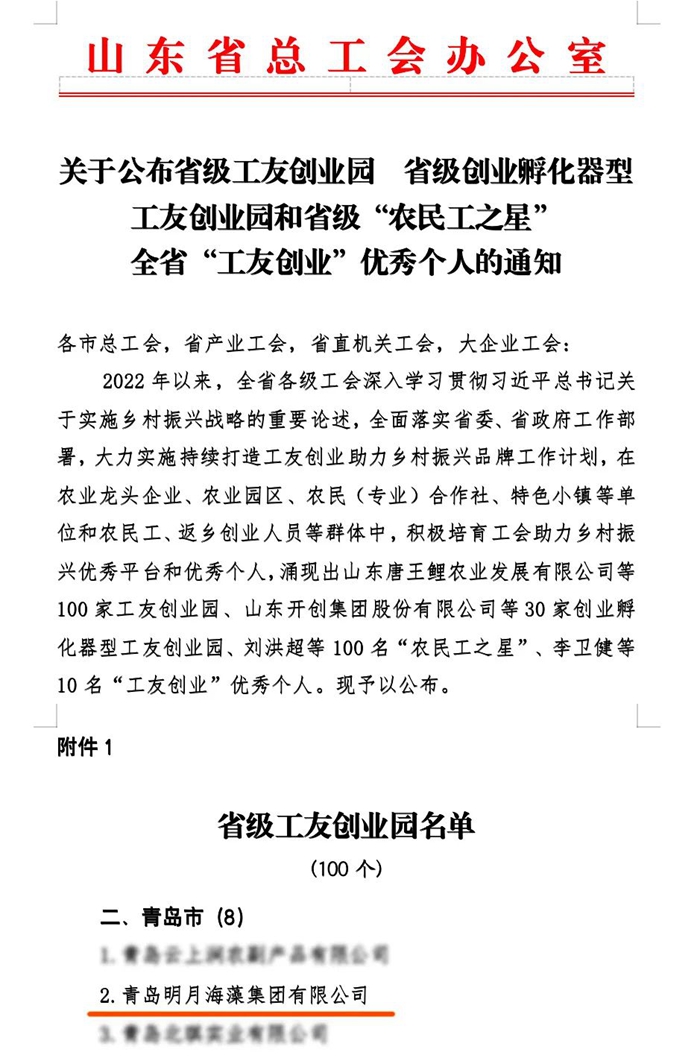 近日,山東省總工會下發《關于公布省級工友創業園、省級創業孵化器型工友創業園、省級“農民工之星”和全省“工友創業”優秀個人的通知》,青島明月海藻集團成功入選省級工友創業園。