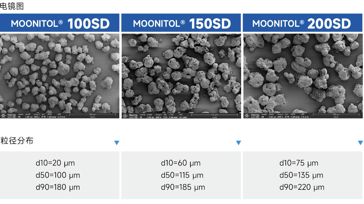 通過噴霧干燥制得的顆粒狀甘露醇SD系列,作為藥用輔料填充劑,具有良好的流動性、可壓性、混合性,特別適應于直壓片工藝和直接混料工藝。